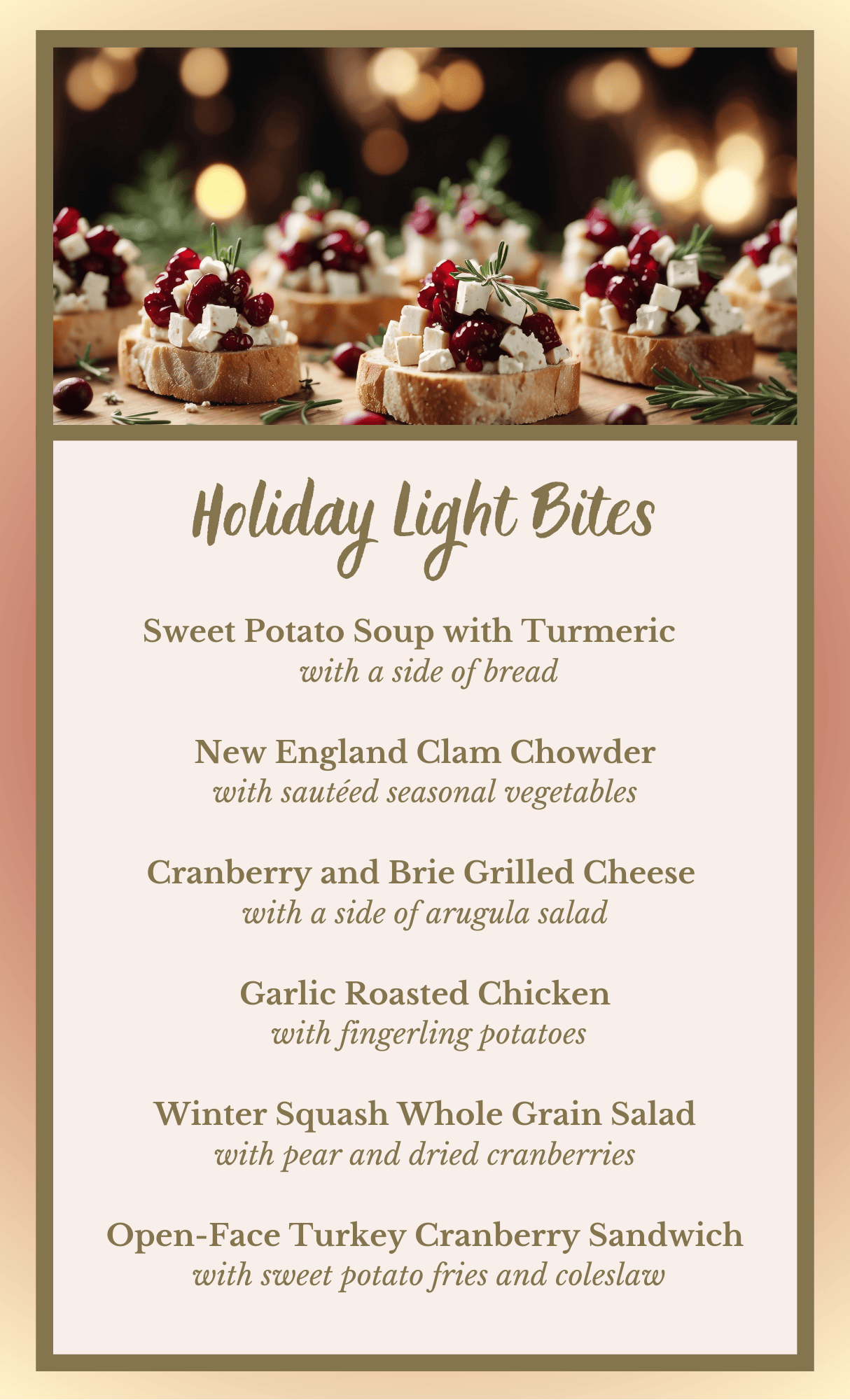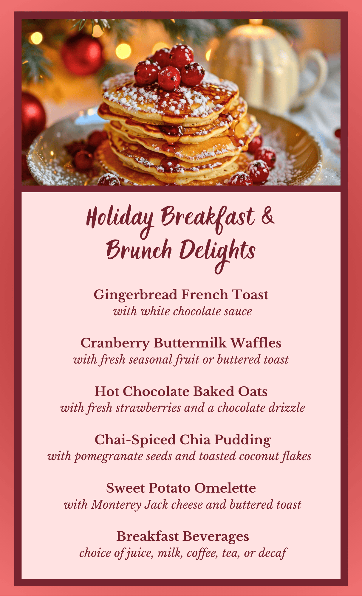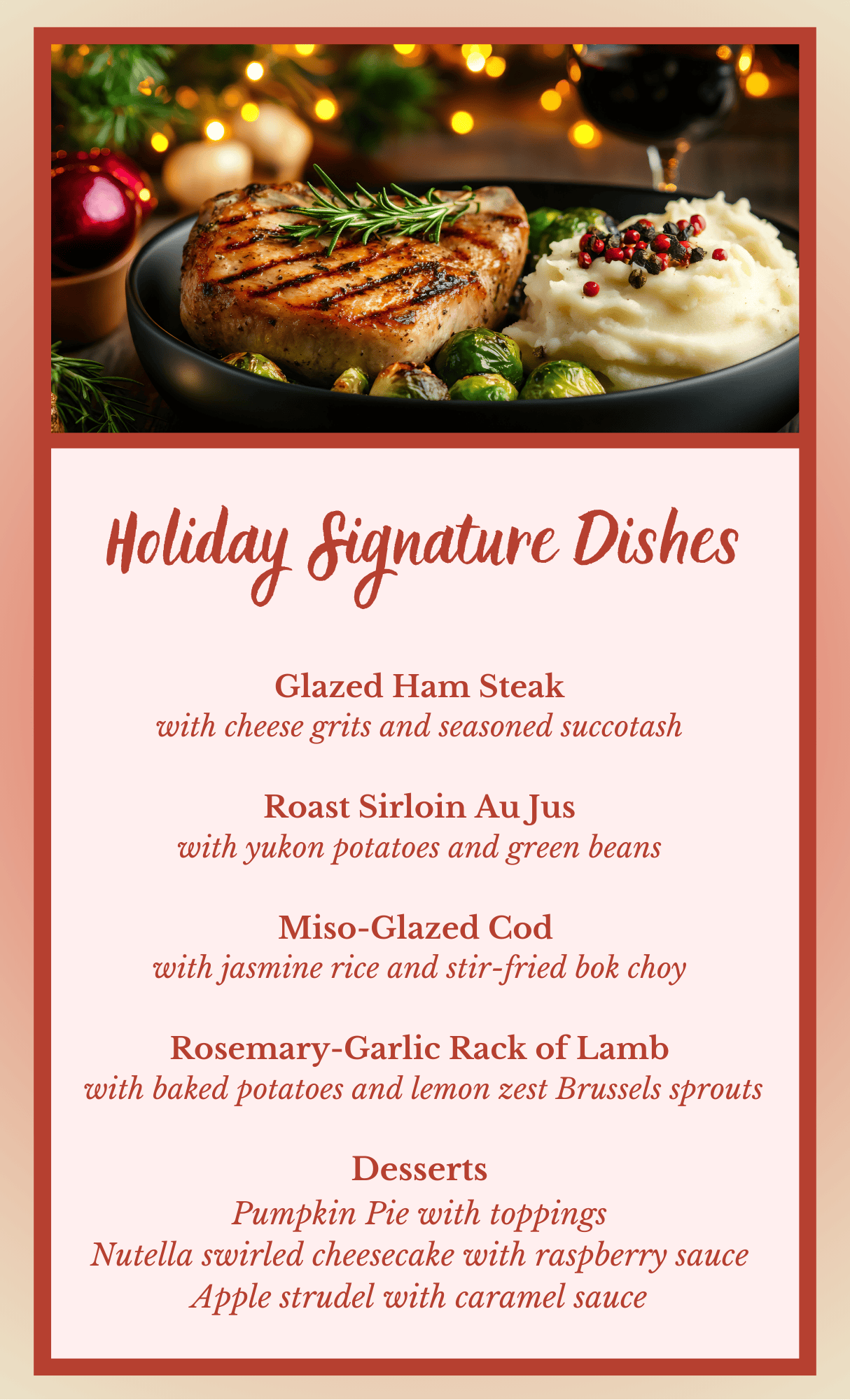 - Menu selections such as prime rib, grilled salmon, fresh vegetables, and much more